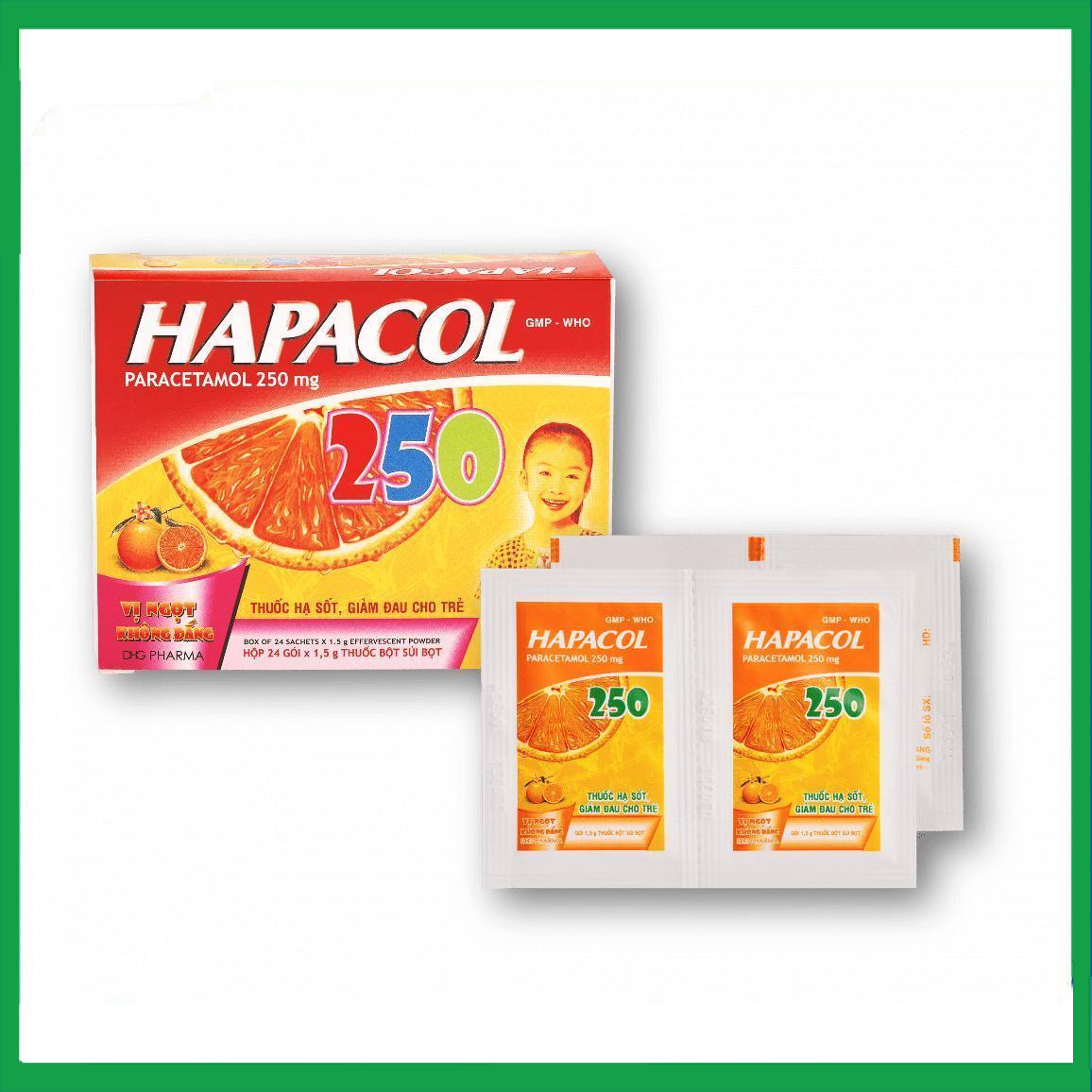 Thuốc Hapacol 250mg là sản phẩm của Công ty Cổ phần Dược Hậu Giang, thành phần chính là Paracetamol, là thuốc dùng để giảm đau, hạ sốt hữu hiệu cho trẻ em trong các trường hợp như cảm, cúm, sốt xuất huyết, nhiễm khuẩn, nhiễm siêu vi, mọc răng, sau khi tiêm chủng, sau phẫu thuật…