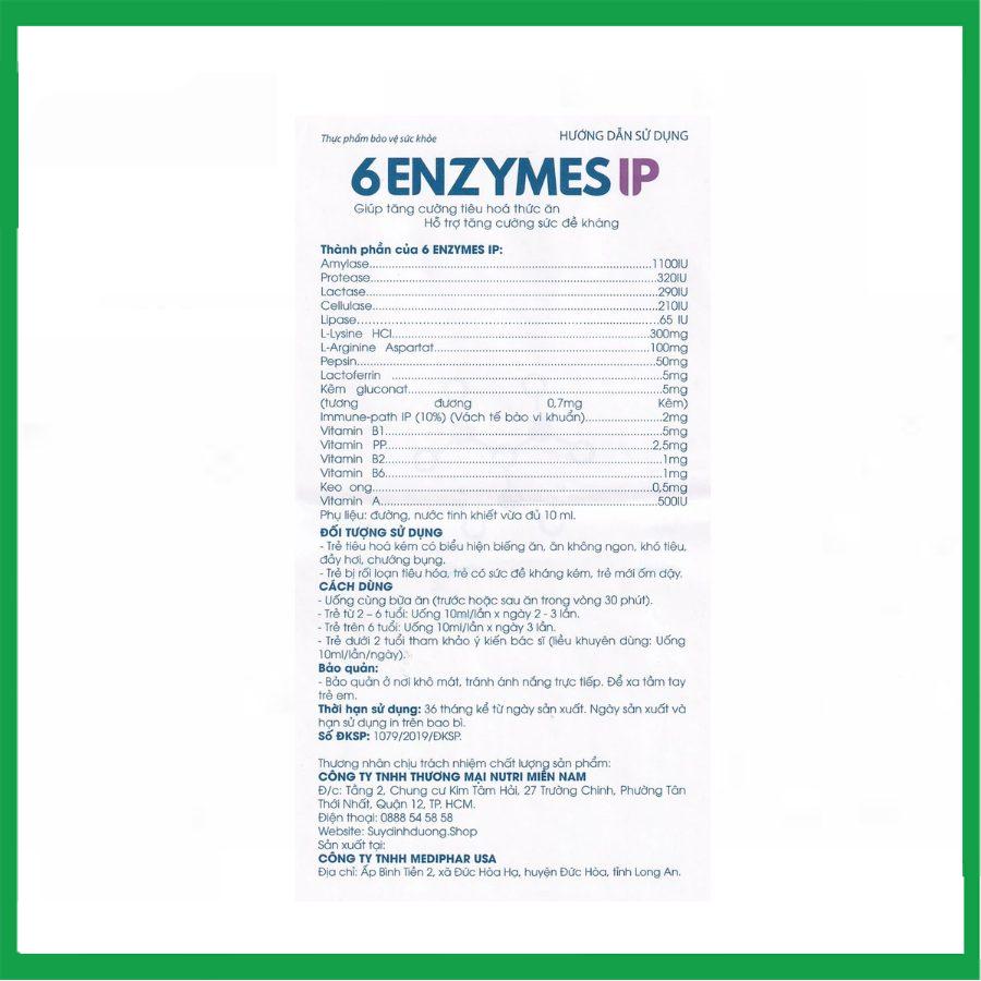 Dung dịch 6 Enzymes Ip bổ sung enzyme tiêu hóa giúp hỗ trợ tăng cường tiêu hóa thức ăn, giảm tình trạng đầy bụng, khó tiêu, biếng ăn, táo bón, đồng thời tăng cường sức đề kháng cho cơ thể.