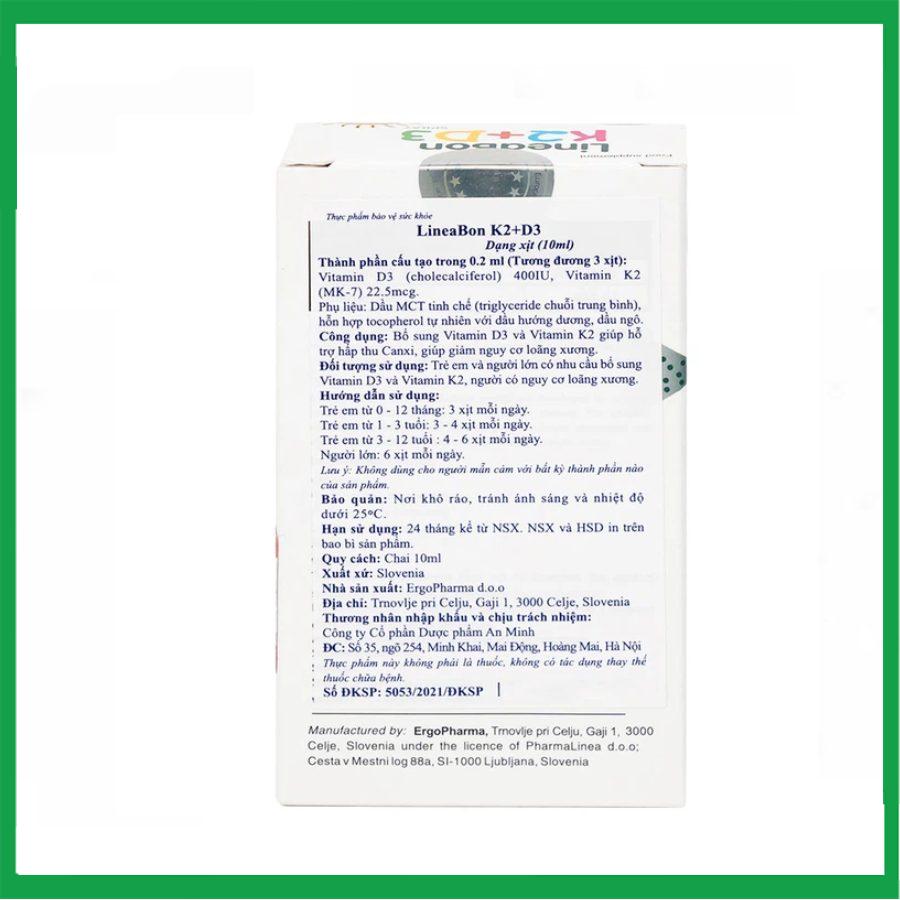 LineaBon K2 + D3 bổ sung vitamin D3 và vitamin K2 giúp hỗ trợ hấp thu canxi, giúp giảm nguy cơ loãng xương.