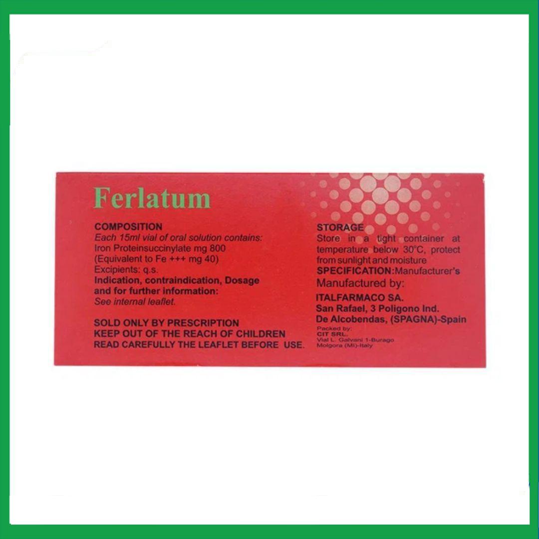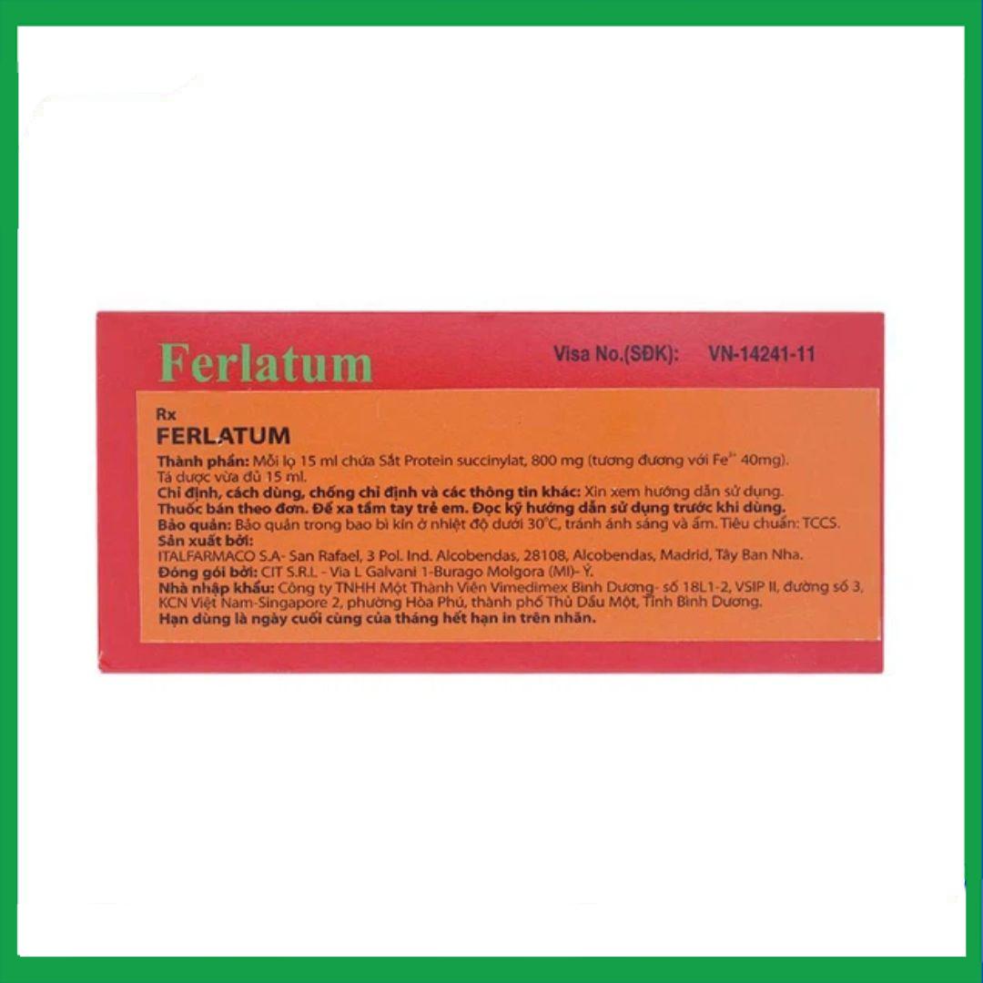 Thuốc Ferlatum 15 ml là dược phẩm của công ty Italfarmaco S.A, chứa thành phần chính sắt, giúp điều trị tình trạng thiếu hụt sắt, thiếu máu do thiếu sắt, thiếu sắt thứ phát ở người trưởng thành trong các trường hợp mất máu mạn tính, phụ nữ mang thai và cho con bú.