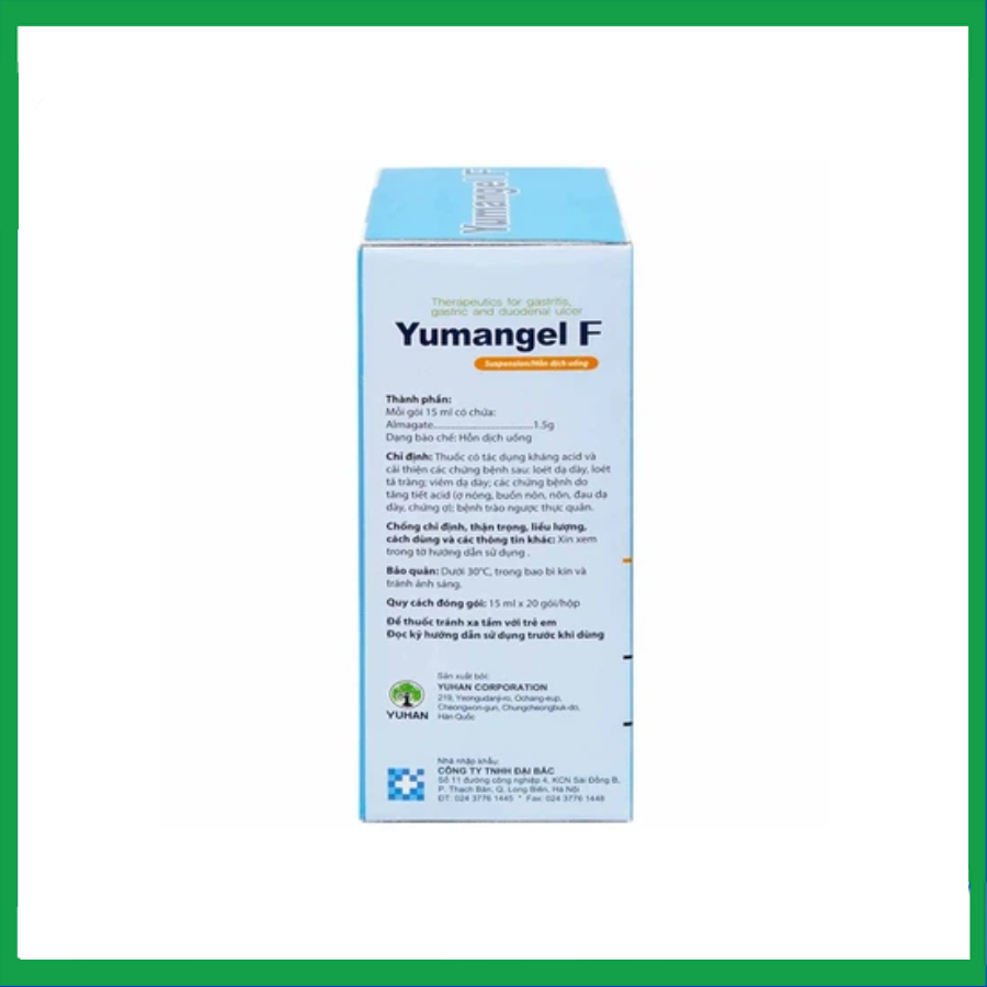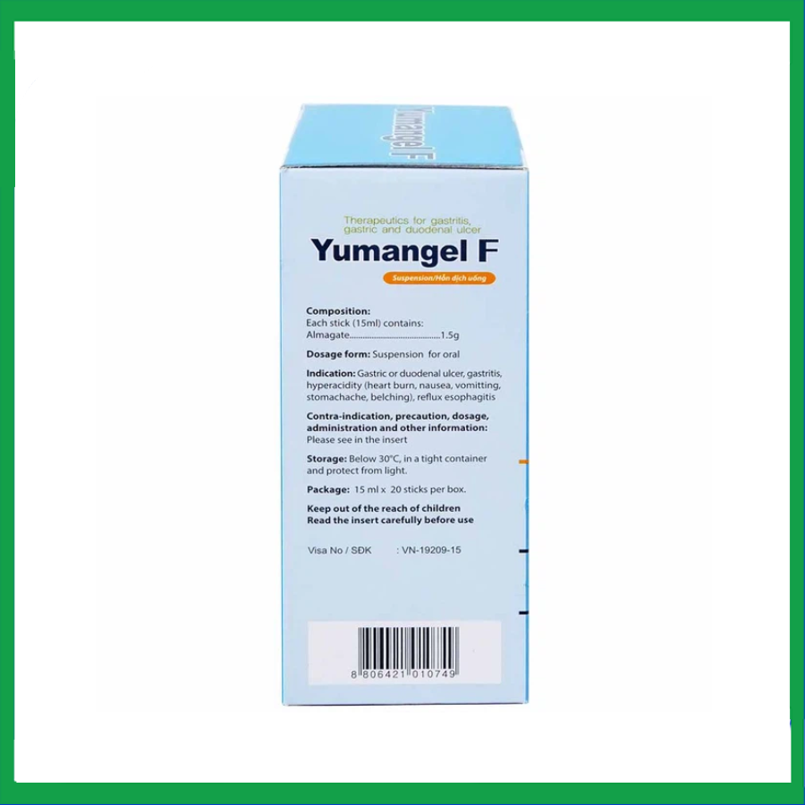 Hỗn dịch uống Yumangel F xanh dương của công ty Yuhan Corporation, với thành phần chính Almagate, là thuốc dùng để điều trị các chứng bệnh sau: Loét dạ dày, loét tá tràng, viêm dạ dày, các chứng bệnh do tăng tiết acid (ợ nóng, buôn nôn, nôn, đau dạ dày, chứng ợ) và bệnh trào ngược thực quản.