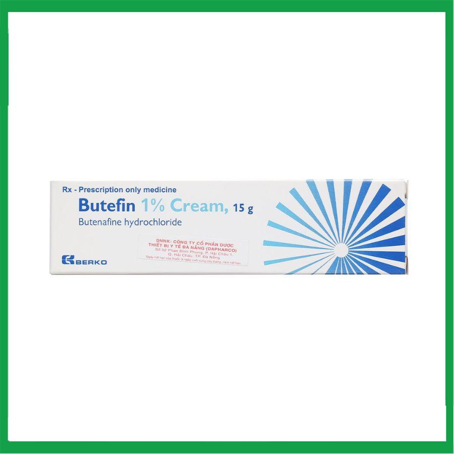 Kem bôi ngoài da Butefin 1% Cream là thuốc kháng nấm chứa hoạt chất Butenafine hydrochloride (10mg/g), thuộc nhóm benzylamin, dùng để điều trị các bệnh nấm da như lang ben, nấm bàn chân, nấm da toàn thân, và nấm bẹn. Thuốc ức chế sinh tổng hợp ergosterol, phá hủy màng tế bào nấm, giúp loại bỏ nhiễm trùng nấm do các chủng như Trichophyton rubrum, Malassezia furfur.
