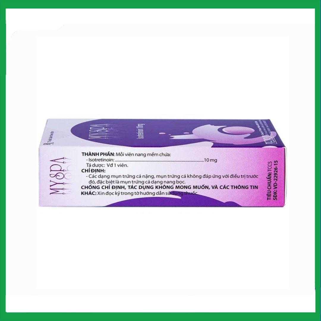 MySpa 10mg là sản phẩm thuốc của công ty cổ phần dược phẩm Me Di Sun với thành phần hoạt chất là isotretinoin được chỉ định trong điều trị các dạng mụn trứng cá nặng, mụn trứng cá không đáp ứng với điều trị trước đó, đặc biệt là mụn trứng cá dạng nang bọc.