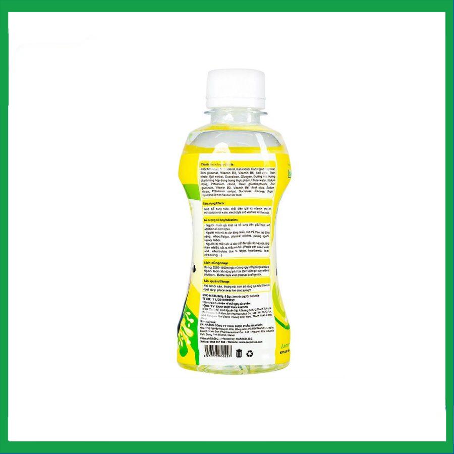 - Phụ gia: Acid citric, trinatri citrat, kali sorbat, sucralose, hương chanh, nước tinh khiết vừa đủ.
