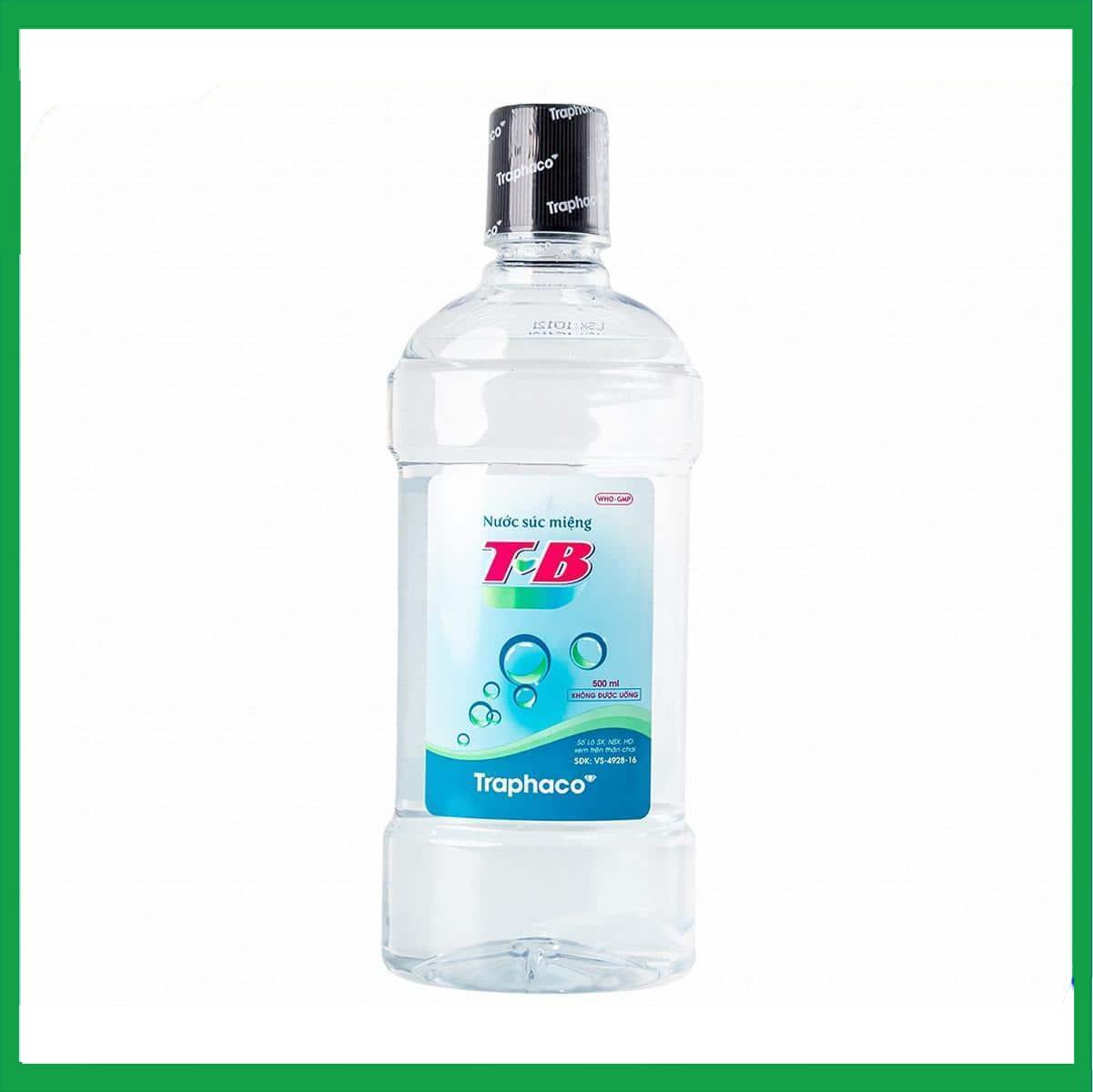 Nước súc miệng T&B Traphaco 500ml của công ty Cổ phần Traphaco, thành phần chính acid boric là thuốc dùng để sát trùng răng miệng, họng, chữa viêm họng, viêm lợi, hôi miệng, chảy máu chân răng, phòng ngừa sâu răng, khử mùi hôi của thuốc lá, thuốc lào, hành tỏi, các chất tanh, giữ cho hơi thở thơm mát.