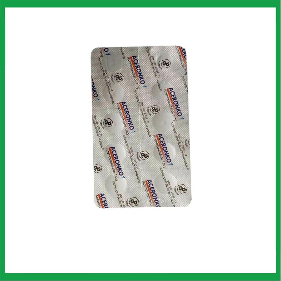 Thuốc Aceronko 1mg là thuốc dạng viên nén, chứa Acenocoumarol 1mg/viên, do Pharbaco (Việt Nam) sản xuất. Acenocoumarol là chất chống đông máu, thuộc nhóm kháng vitamin K, giúp ngăn ngừa và điều trị huyết khối tắc mạch trong các bệnh tim mạch như rung nhĩ, nhồi máu cơ tim, hoặc huyết khối tĩnh mạch sâu. Thuốc chỉ được bán theo đơn bác sĩ.