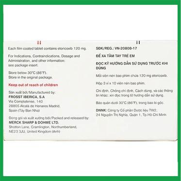 Thuốc ARCOXIA 120mg của Công ty Frosst Iberica, S.A., chứa dược chất chính là etoricoxib là 1 chất ức chế COX-2, giúp giảm đau và sưng (viêm) ở khớp và cơ bắp của người bị viêm xương khớp, viêm khớp dạng thấp, viêm đốt sống dính khớp và bệnh gút.
