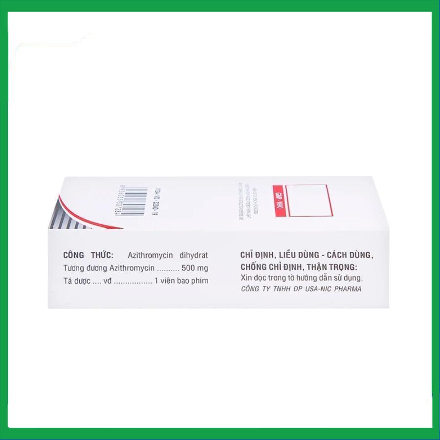 AZITNIC 500 USA-NIC 6V của USA – NIC PHARMA Co., Ltd, thành phần chính azithromycin. Thuốc dùng để điều trị các nhiễm khuẩn đường hô hấp dưới (như viêm phế quản cấp, viêm phổi), nhiễm khuẩn đường hô hấp trên (như viêm xoang, viêm họng và amidan, viêm tai giữa, viêm yết hầu), các nhiễm khuẩn da và mô mềm, bệnh lây truyền qua đường tình dục ở cả nam lẫn nữ do Chlamydia trachomatis hoặc Neisseria gonorrhoeae.