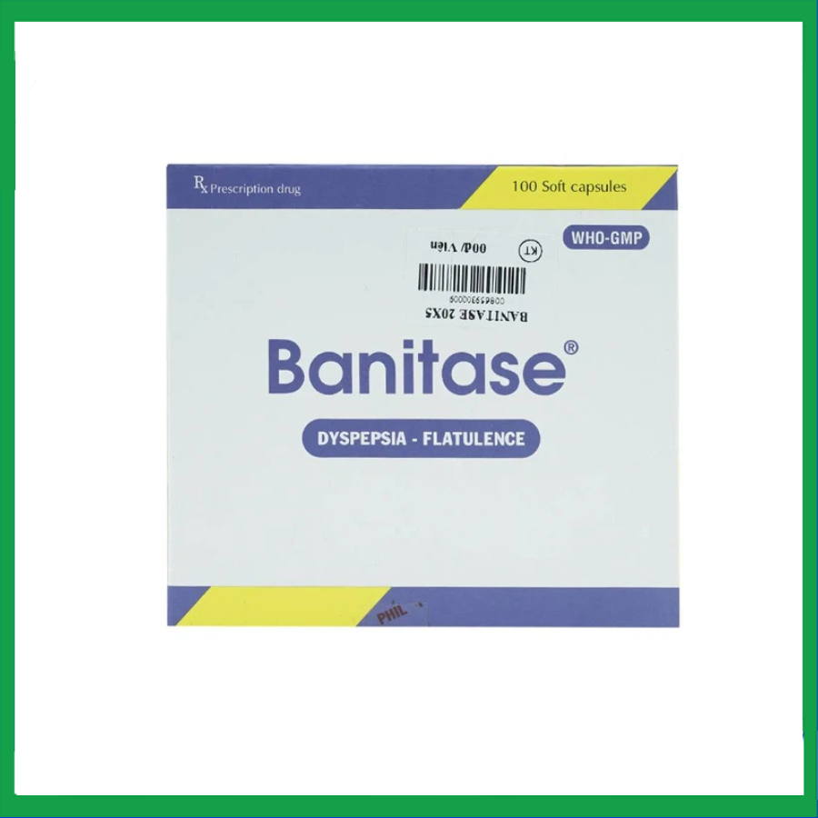Banitase của Công ty TNHH Phil Interpharma. Thuốc có thành phần chính là Trimebutine maleate 100mg, Acid dehydrocholic 25mg, Pancreatin (Pancrelipase) 150mg, Bromelains 50mg, Simethicone 300mg. Đây là thuốc dùng trong điều trị các triệu chứng liên quan đến hệ tiêu hóa, với hoạt chất là Trimebutine.