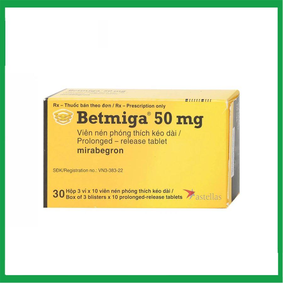 Thuốc Betmiga 50 là sản phẩm của Astellas, có thành phần chính là Mirabegron. Đây là thuốc được sử dụng để điều trị triệu chứng tiểu gấp, tiểu nhiều lần và/hoặc tiểu gấp không kiểm soát xảy ra ở bệnh nhân người lớn bị hội chứng bàng quang tăng hoạt.