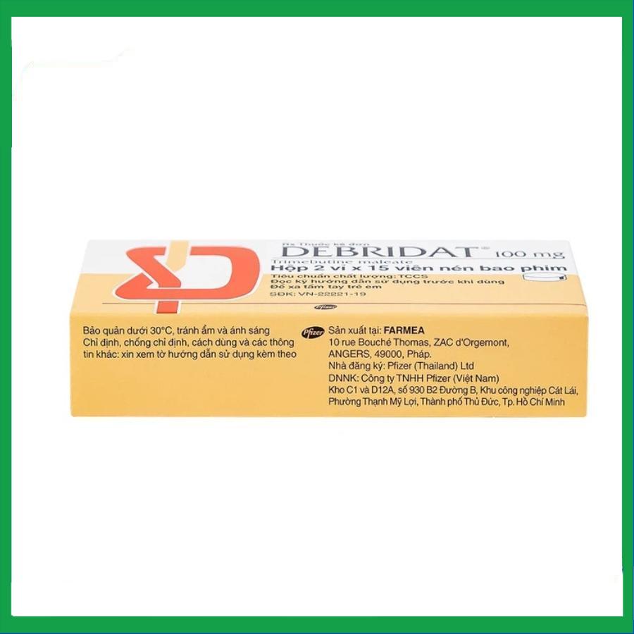 Debridat dạng viên nén bao phim của FARMEA – FRANCE có thành phần chính là debridat 100mg. Thuốc được chỉ định dùng để điều trị triệu chứng đau do rối loạn chức năng của ống tiêu hóa và đường mật. Điều trị triệu chứng đau, rối loạn sự chuyển vận, bất ổn ở ruột có liên quan đến rối loạn chức năng của ruột.