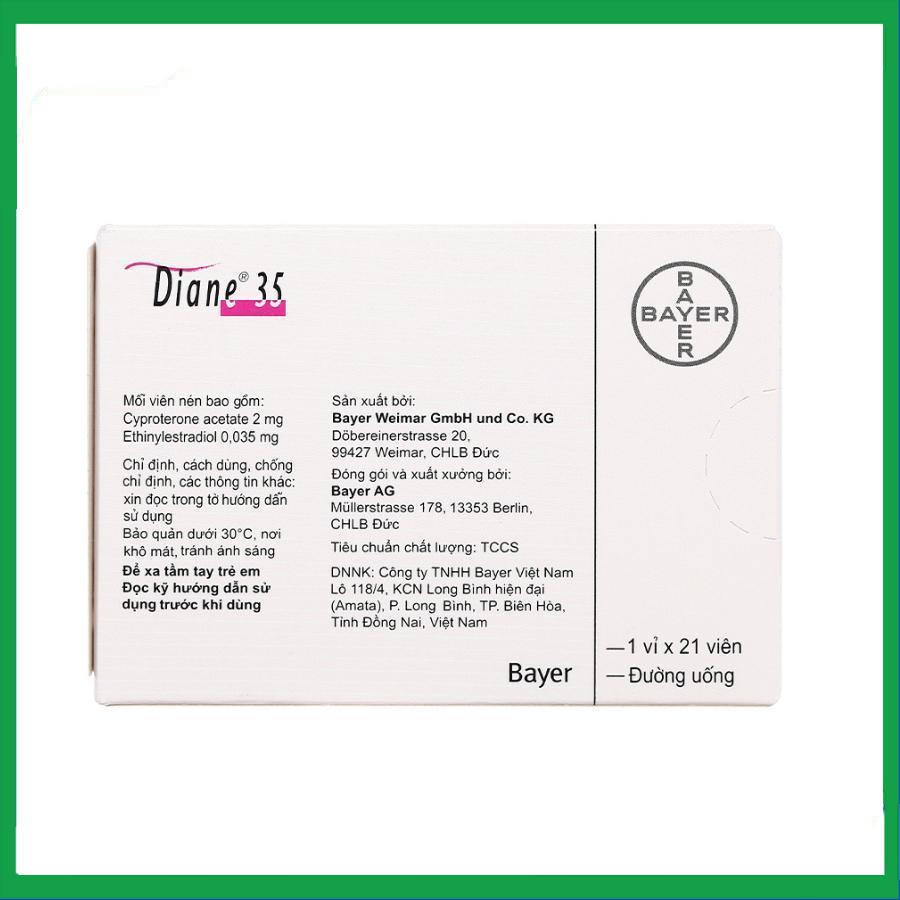 Diane – 35 có thành phần chính Ethinylestradiol và cyproteron acetat để điều trị mụn trứng cá mức độ vừa đến nặng do nhạy cảm với androgen (kèm hoặc không kèm tăng tiết bã nhờn) và/hoặc chứng rậm lông ở phụ nữ độ tuổi sinh sản, ngoài ra còn là thuốc tránh thai đường uống.