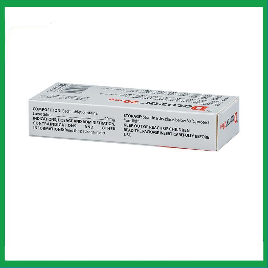 Thuốc dolotin 20mg là sản phẩm của Domesco chứa hoạt chất Lovastatin dùng điều trị dùng bổ trợ chế độ ăn uống hạn chế chất béo bão hòa và cholesterol để làm giảm cholesterol toàn phần và LDL-C đến mục tiêu điều trị khi bệnh nhân không đáp ứng đầy đủ với chế độ ăn uống và các biện pháp không dùng thuốc khác. Giúp hỗ trợ dự phòng tiên phát bệnh mạch vành, tăng cholesterol huyết.
