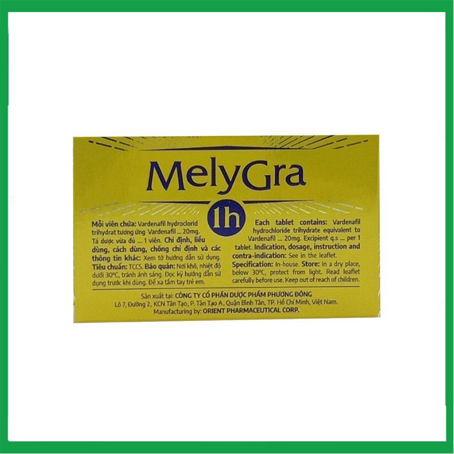 Thuốc MelyGra 1h trị rối loạn cương dương ( Hộp 2 viên). Melygra 1h có chứa thành phần là Vardenafil, có tác dụng ức chế PDE5 khởi phát nhanh và cho hiệu quả đáng tin cậy có thể được duy trì sử dụng ở cả người có bệnh nền như tiểu đường, tăng huyết áp. Dạng bào chế là viên nén bao phim nên rất tiện lợi khi sử dụng.