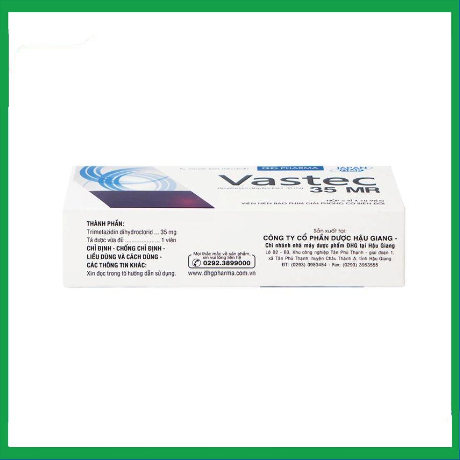 Vastec 35 MR được sản xuất bởi Công ty Cổ phần Dược Hậu Giang, với thành phần chính trimetazidine dihydrochloride, là thuốc dùng để điều trị triệu chứng đau thắt ngực ổn định không được kiểm soát đầy đủ hoặc không dung nạp với các liệu pháp điều trị đau thắt ngực khác.