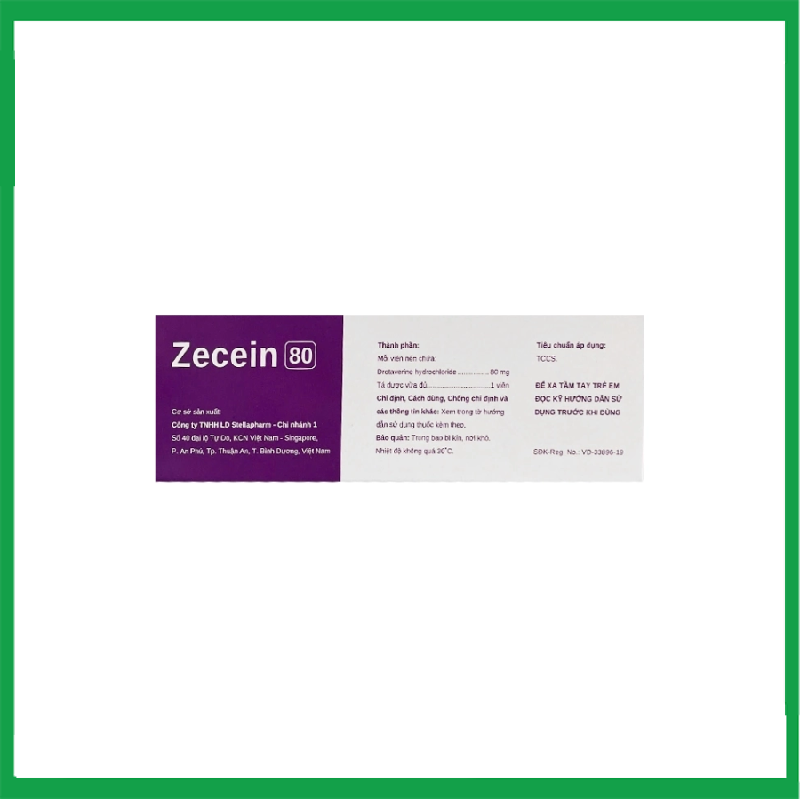 Thuốc Zecein 80 Stella là viên nén chứa Drotaverin hydroclorid 80mg, do Công ty TNHH Liên doanh Stella Pharm (Việt Nam) sản xuất. Drotaverin là thuốc chống co thắt cơ trơn, ức chế phosphodiesterase-4 (PDE4), mạnh hơn Papaverin, giúp giảm đau do co thắt ở đường tiêu hóa, đường mật, tiết niệu, và tử cung. Phù hợp cho hội chứng ruột kích thích, đau quặn mật, đau bụng kinh, hoặc sỏi thận.