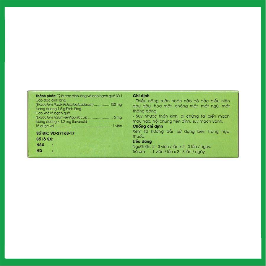 - Cao khô lá Bạch quả (Extractum Folium Ginkgo siccus) 5mg (tương đương flavonoid ≥ 1,2mg).