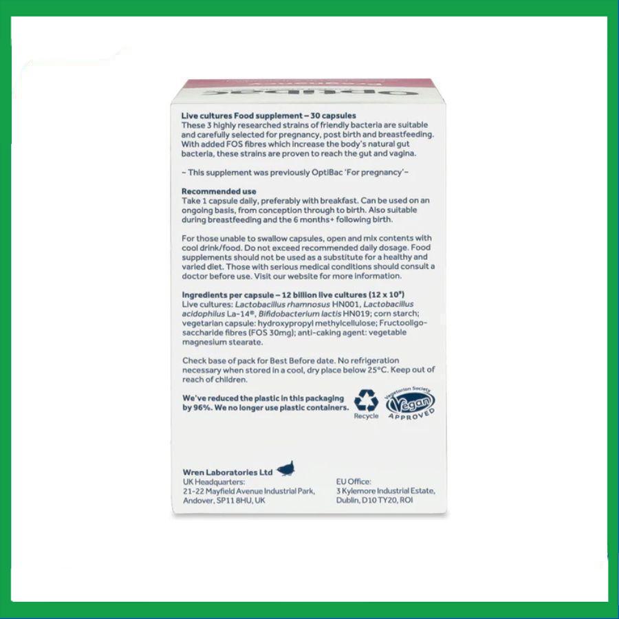- Optibac Pregnancy là một sản phẩm bổ sung chất dinh dưỡng dành cho phụ nữ trong giai đoạn thai kỳ và cho con bú. Sản phẩm này chứa các chủng lợi khuẩn như Lactobacillus rhamnosus HN001, B. Lactis HN019 và Lactobacillus acidophilus La-14. Chúng hỗ trợ sức khỏe đường ruột và âm đạo, cải thiện hệ tiêu hóa. Sản phẩm được Công ty TNHH Optibac Probiotics (Việt Nam) sản xuất và được cấp phép bởi Cục An toàn thực phẩm - Bộ Y tế.