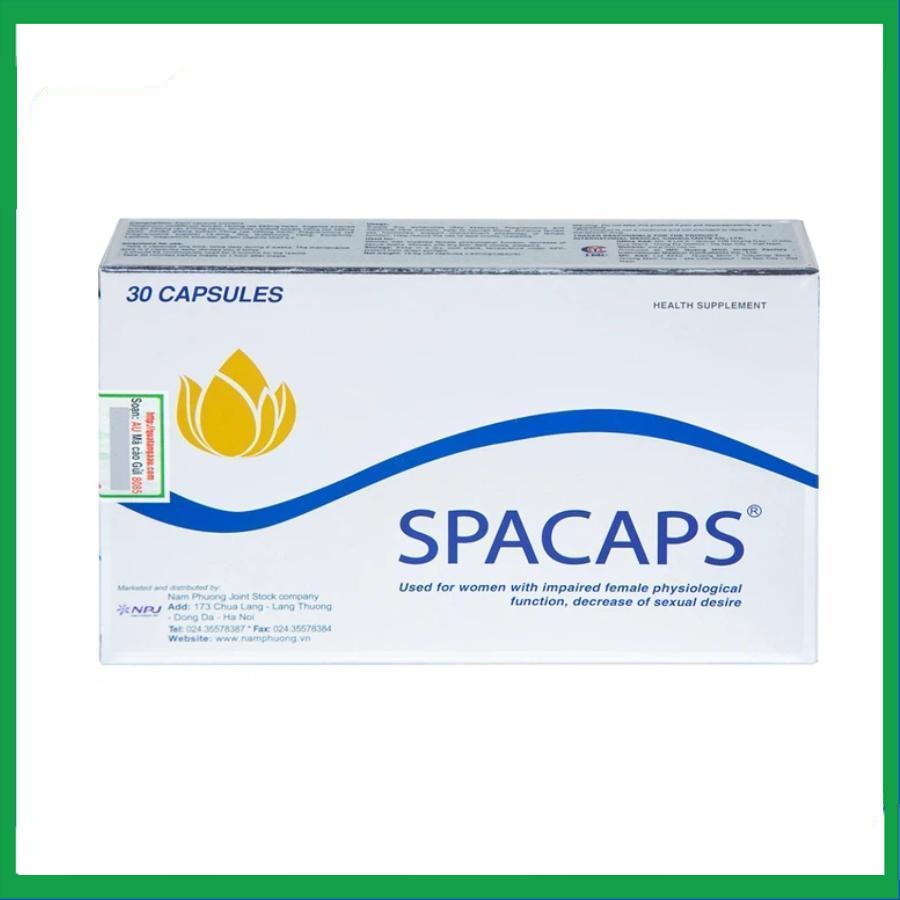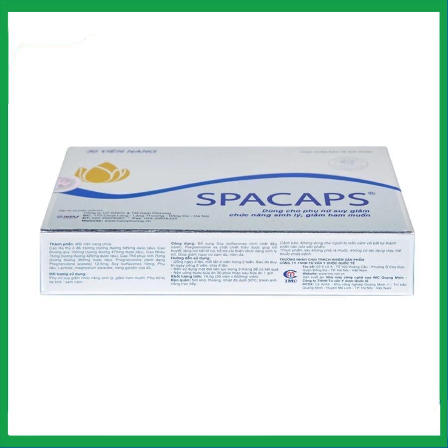 Với công thức đặc biệt 100% thảo dược thiên nhiên, Viên uống Spacaps được các chuyên gia khuyên dùng cho phụ nữ trong giai đoạn tiền mãn kinh, mãn kinh, giúp cải thiện các triệu chứng trong giai đoạn đặc biệt này, đồng thời làm đẹp da, ngăn ngừa sạm nám. Bên cạnh t hỗ trợ bổ máu, thông kinh mạch, tăng sinh lực và làm mạnh gân cốt, chống loãng xương, cao huyết áp…